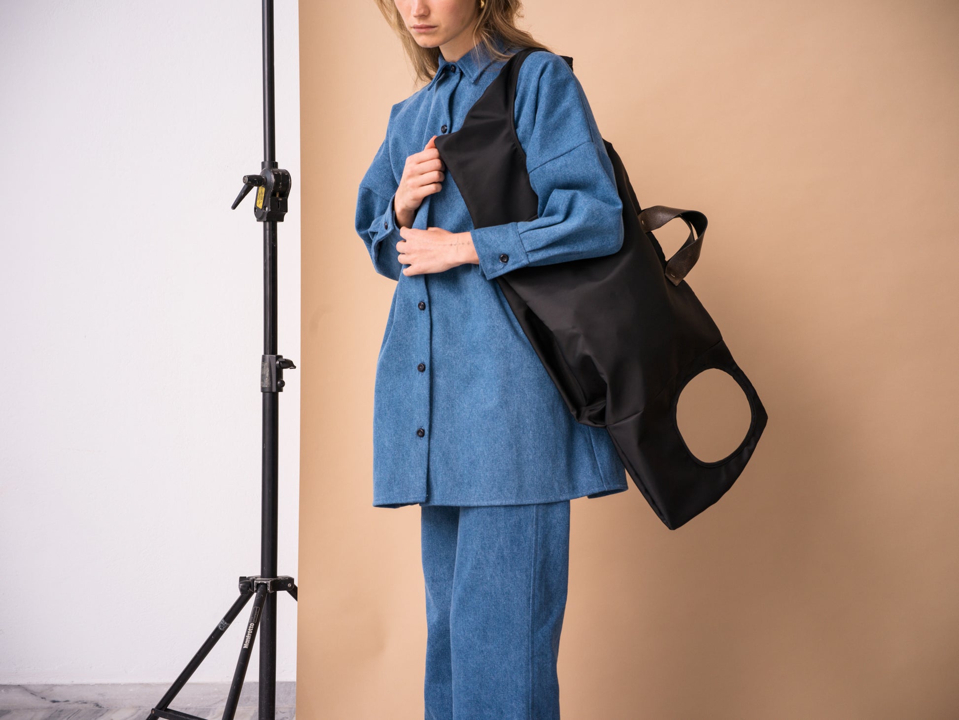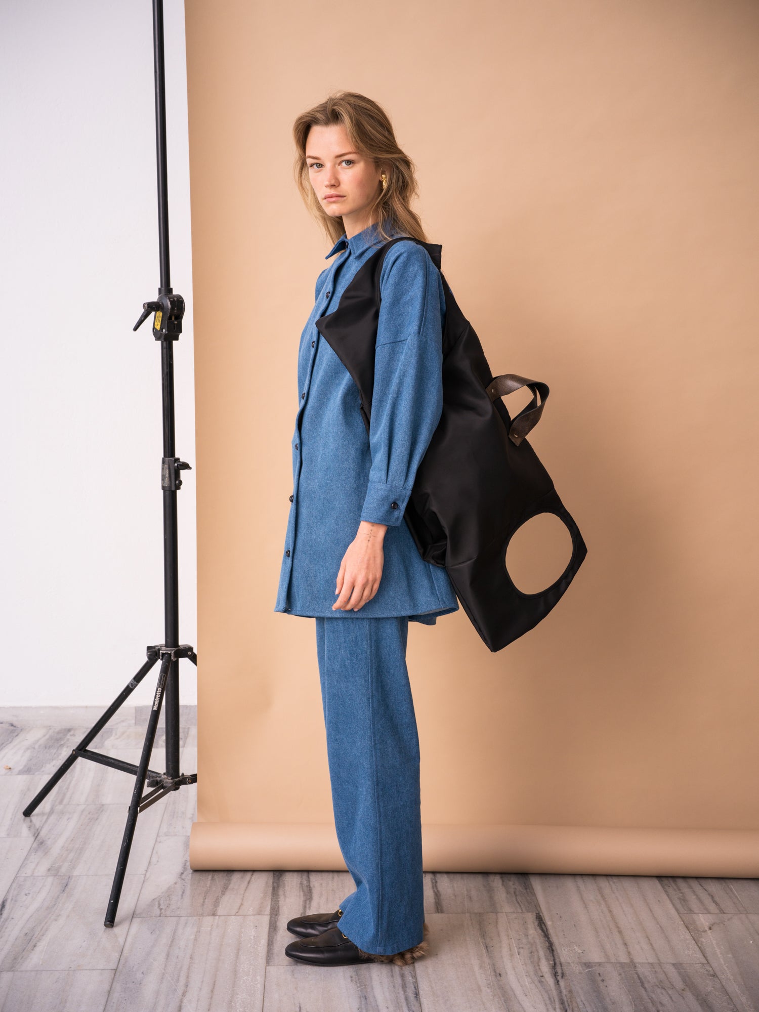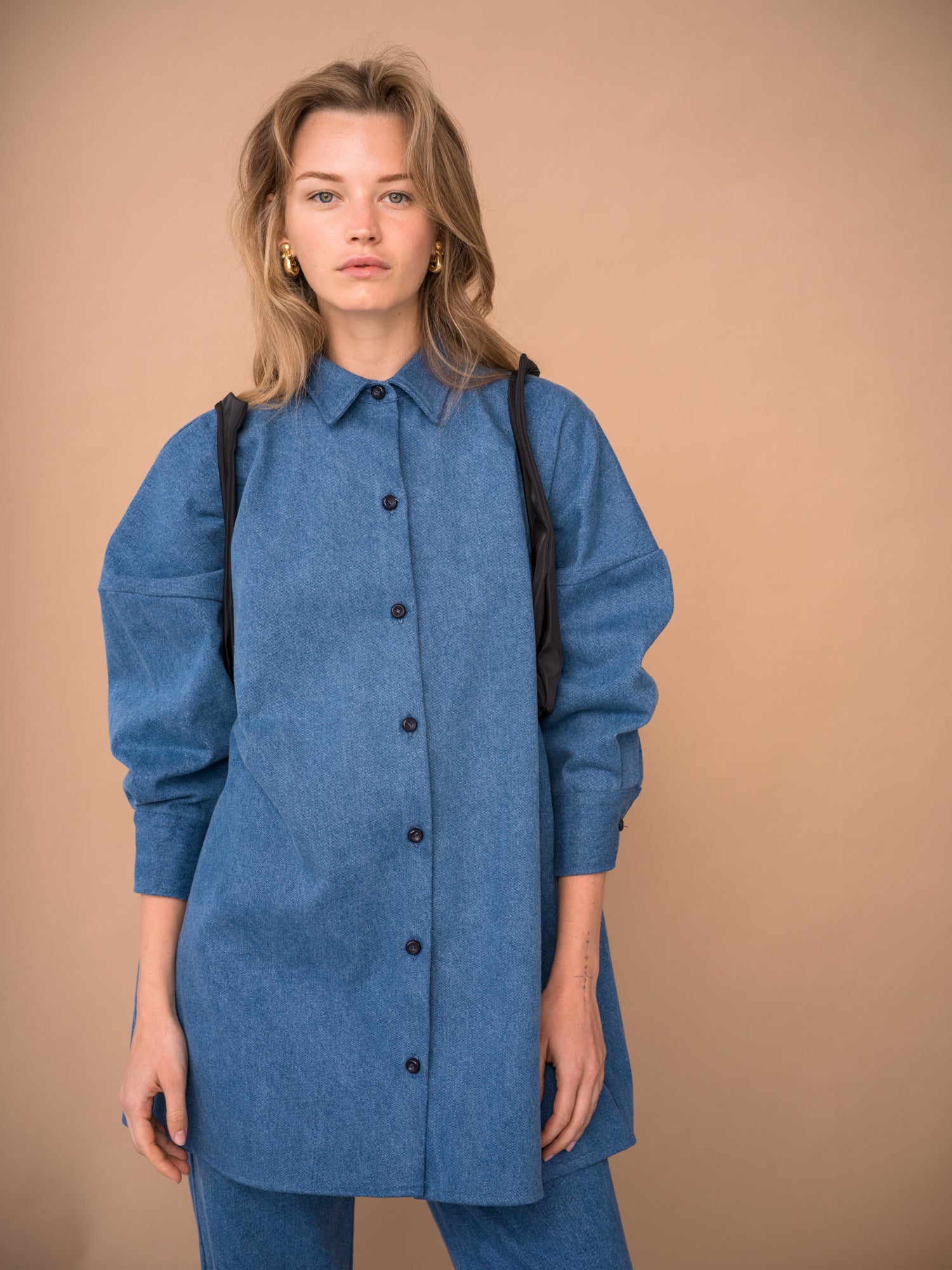 This heavy-weight denim shirt, has a loose form with stright hems and one large pleat at the back.