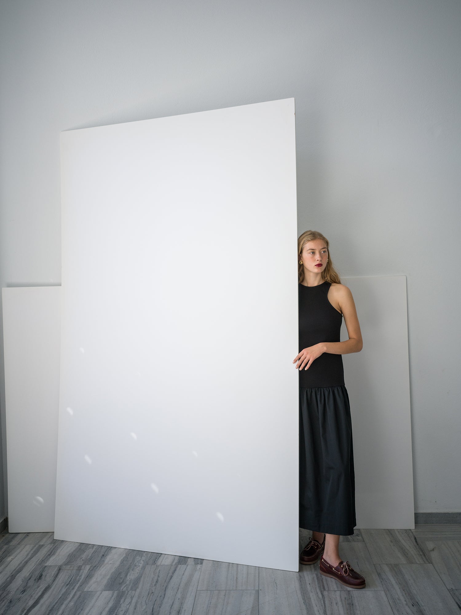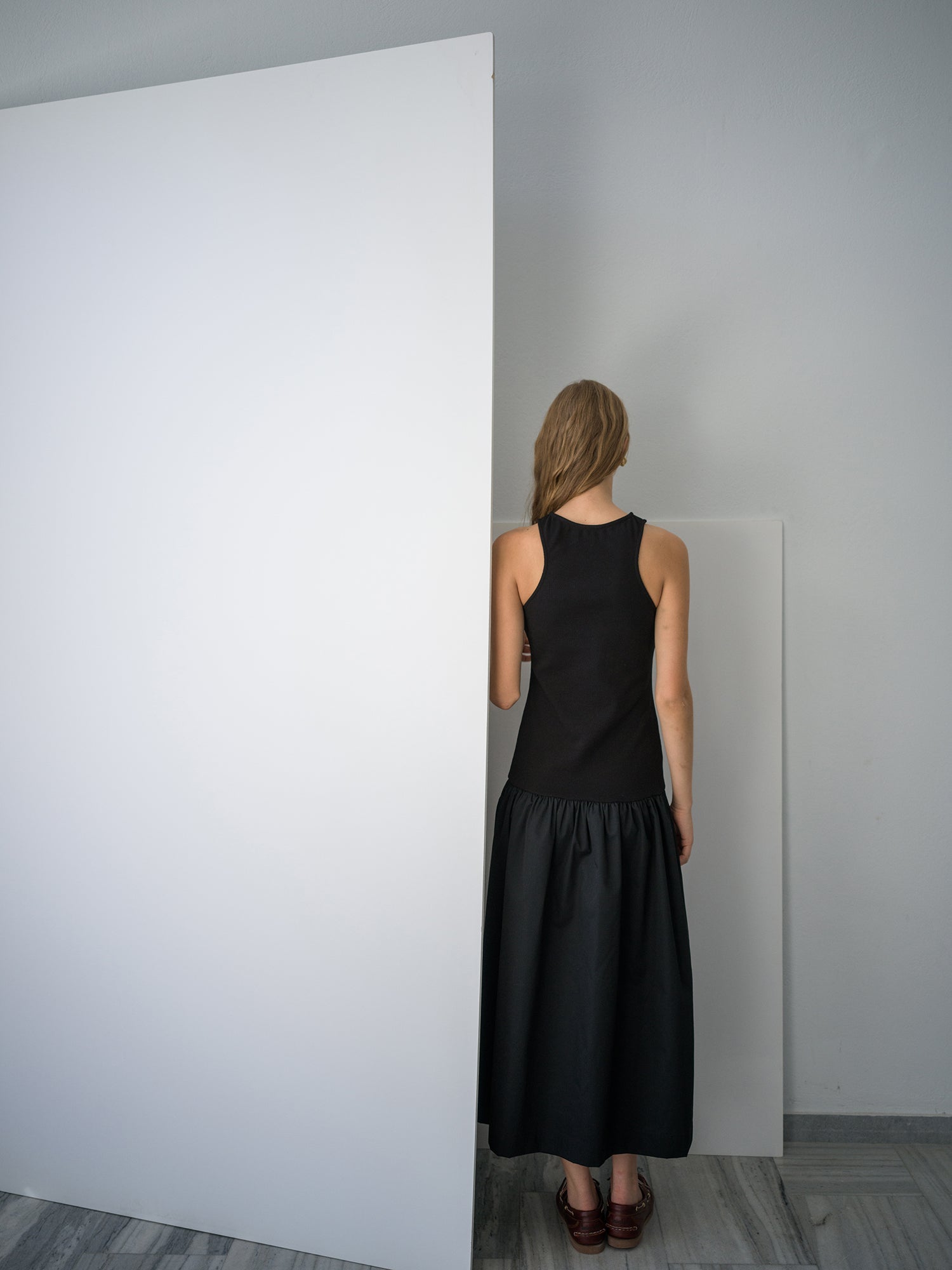Ankle-length dress with defined upper part and fluid lower part.
