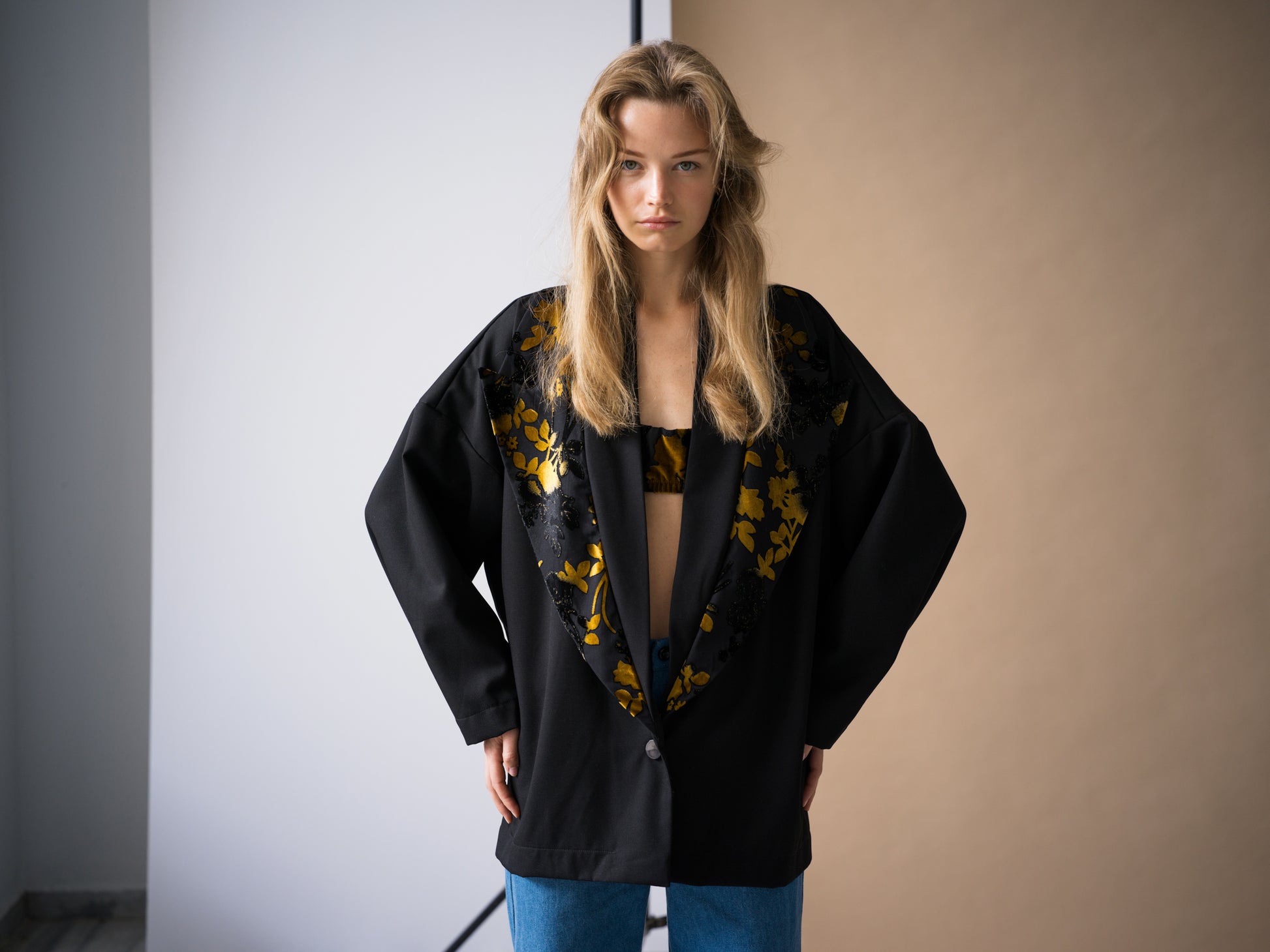 Wear the Phoenix Bralette with the Amber Blazer or the Boxy Blazer and the Pair of Jeans in Original Blue.